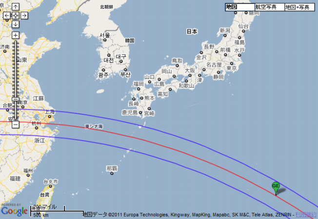 下の例では本影の中心が通る道筋が赤い線で描かれています。この線上では太陽と月の視位置が完全に重なるタイミングがあります。この時、食分は最大になります。