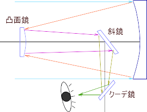 分類: 反射式 クーデ式天体望遠鏡は基本的にはナスミス式と同じです。異なるのは斜鏡で反射させた光をクーデ鏡と呼ばれる鏡やプリズムを用いて再度反射させる点です。こうすることによって赤道儀の極軸へ光を導き、常に同じ固定位置から天体観測できるようになるという利点があります。反面、何度も鏡やプリズムで光を反射させるので光量の損失が大きくなってしまいます。また、視野が狭くなるのも短所のひとつです。クーデ式はナスミス式と同様、天文台などの大きな天体望遠鏡に向いています。