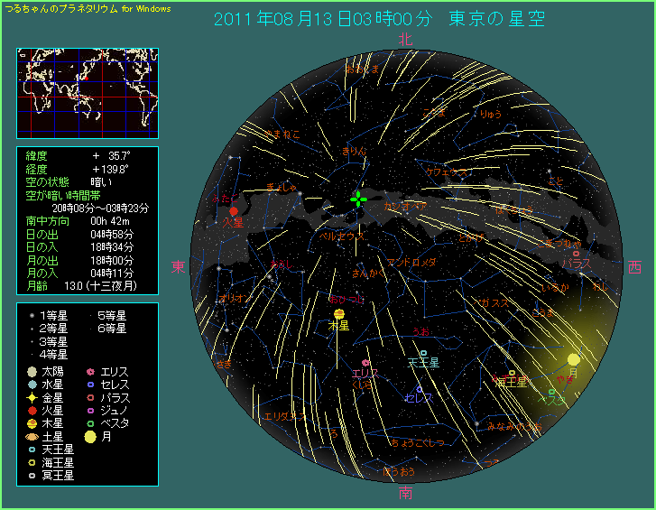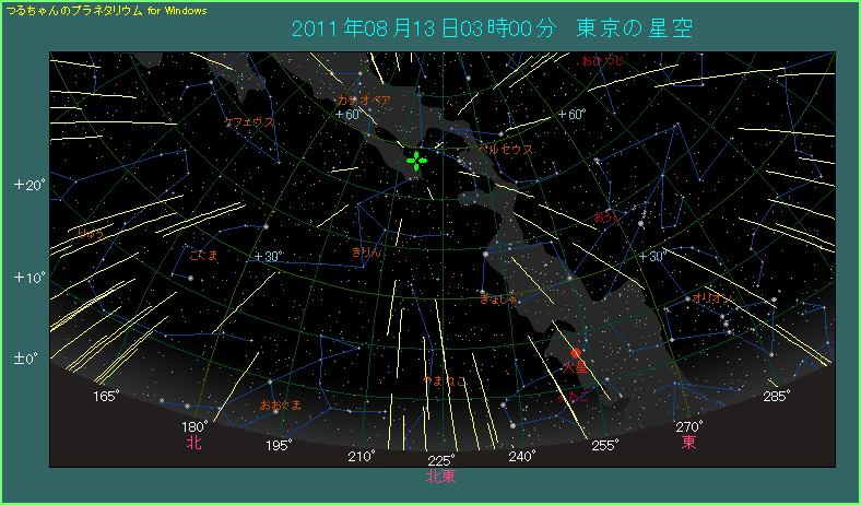 2011年のペルセウス座流星群は、極大が8月13日15時頃と予想されています。極大が日中に当たってしまいますから、出現のピークを観測することはできません。おまけに翌日が満月にあたります。大きな月が一晩中夜空を照らしますから、暗い流星を観測することができなくなってしまいます。そんなわけで2011年の観測条は最悪といえます。月が直接視界に入らないように遮蔽物を利用するなど、工夫して観測するようにしてください。