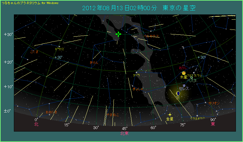 流星観測では極大時刻も大事ですが、もう一つ気になるのが月明かりの条件です。月明かりが大きいと月の光に邪魔をされて、観測することのできる流星の数が少なくなってしまうからです。2012年8月13日未明の場合、東京の場合だと月が0時35分に昇ってきます。しかしながら月齢が24.5ということで、下弦から3日過ぎており、半月よりも細くなっています。流星観測者にとって影響はありますが、致命的というほどのものではありません。
