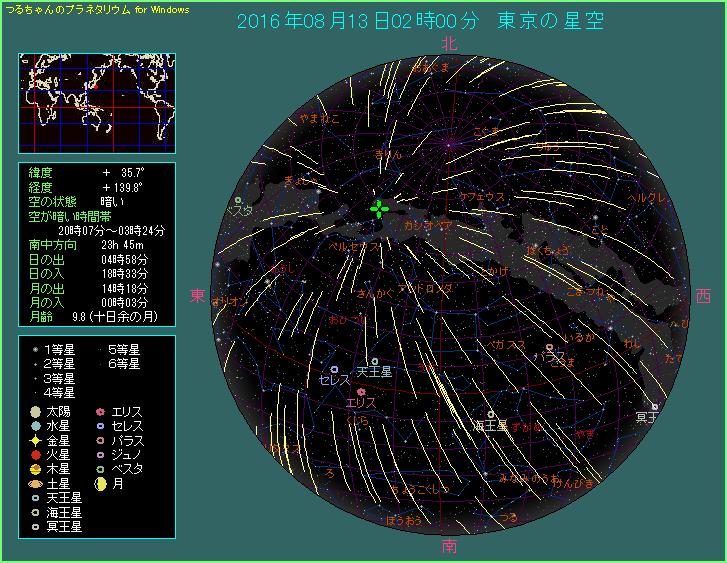 流星観測では極大時刻も大事ですが、もう一つ気になるのが月の条件です。月明かりが大きいと月の光に邪魔をされて、観測できる流星の数が少なくなってしまうからです。2016年の場合は13日2時の月齢が9.8です。東京では日付が変わるころ、0時3分に月が沈みます。以降は観測に影響がなくなりますから、条件的には良いといえます。