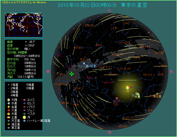 その理由は下の星図をご覧ください。翌日に満月をひかえた大きな月明かりがあります。東京の場合を例にとると、月の入り時刻は4時54分なのに対し、空が白み始めるのは4時28分。これでは暗夜での観測は無理といえます。いくら極大時刻の条件が良くても、満月に近い大きな月明かりに一晩中夜空を照らされてはたまりません。残念ながら2010年の流星の出現数は大きく減少してしまうでしょう。