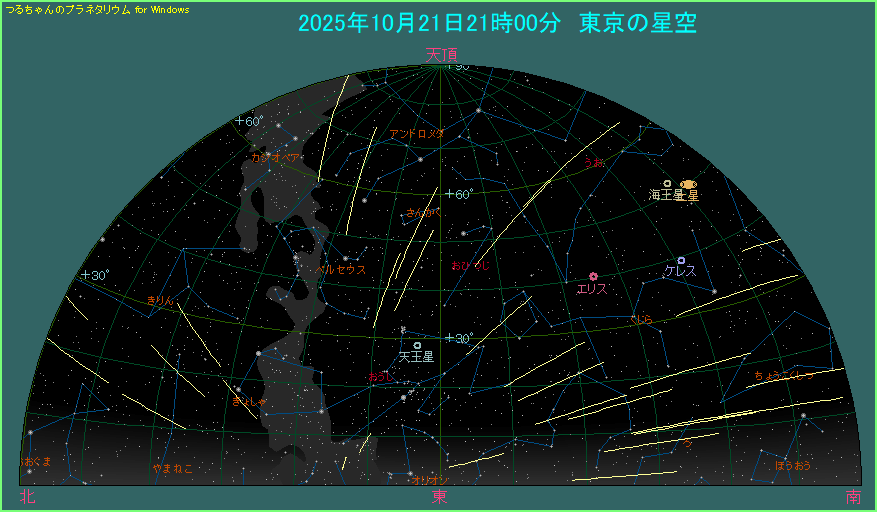 次に月明かりの条件を確認しましょう。21日21時の月齢は29.7で、25分後に新月になります。月明かりの影響を受けませんから暗い流星まで見ることができて、観測できる流星数が増えるでしょう。月明かりの条件は最良です。
