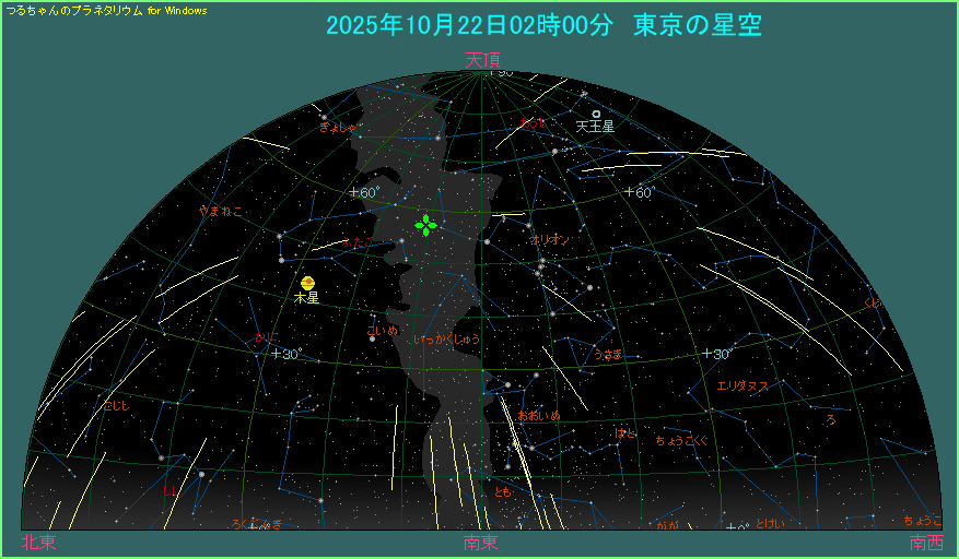 この時期のオリオン座は、東京の場合で21時頃と意外に早い時間に東の空から昇ってきます。そしてオリオン座が西の空へ沈むのは夜明け後のことになります。そういう意味ではオリオン座流星群はほぼ一晩中観測できるのですが、輻射点の高度が30度を超えてくる0時頃からがオススメの時間帯となってきます。その後は夜明け前頃に輻射点は最も高くなりますから、夜半から夜明け前までが観測に最適な時間帯ということができます。