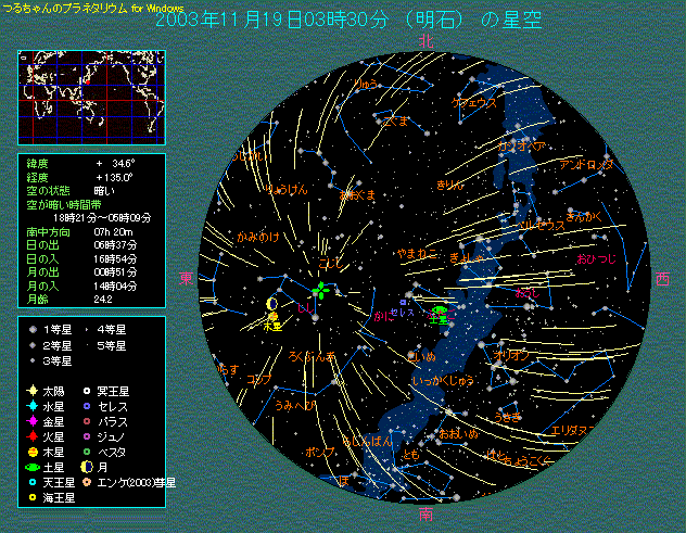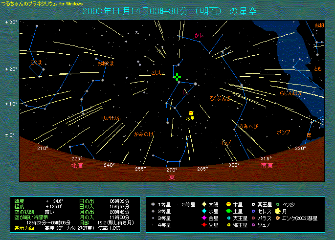 1回目のピークは11月14日未明です。これは500年も前のダスト・トレイルによるものですので、あまり期待はもてないかもわかりませんが、3回のピークの中で日本からは最も期待できるピークとなります。2回目のピークは19日の9時頃ですので、19日の未明に見るのが良いでしょう。そして、3回目のピークは19日の17時頃なので、こちらは日本からは期待がもてません。