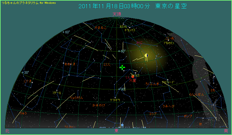 気になる2011年ですが、今年も昨年に続いて出現は低調なものになりそうです。流星の出現数は1時間当たりに最大で10個前後ではないかと思われます。18日の夜明けにかけて出現数が次第に増加いくでしょう。極大時刻は11月18日の12時頃と予想されていますから、日本では昼間にあたってしまいます。また、この日は残念なことに、下弦前日という半月よりも少し太った月が輻射点のあるしし座付近にあります。東京での月の出は17日の22時10分ですから、一晩中夜空を月が照らすことになります。