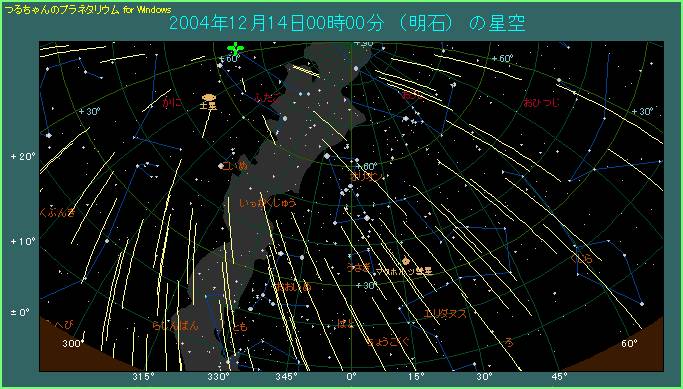 2004年12月14日0時頃 南の空でのふたご座流星群の出現イメージ |