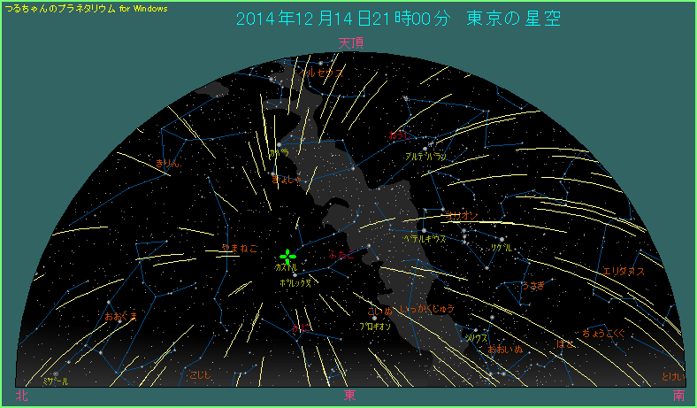 ふたご座流星群だけでなく、流星観測では極大時刻が重要な要素となります。極大時刻が昼間にかかってしまうと、流星が最も多く流れる時間帯に観測できなくなり、出現数が少なくなってしまうからです。2014年ふたご座流星群の極大時刻は、12月14日21時頃と予想されています。日本では夜間に当たりますが、輻射点(放射点)の位置はまだそれほど高くありません。最も高くなる2時ごろからは5時間ほどずれています。しかし、極大時刻を少しくらい外れても、ふたご座流星群の場合はそれなりに楽しむことができます。もともと出現数が多い流星群ですし、極大をはさんで前後半日くらいは高いレベルで活動してくれますから、極大時刻にあまり神経をとがらせる必要はありません。