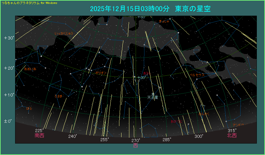 ふたご座流星群の場合、輻射点は一晩中見えていますので時間にとらわれる必要はないでしょう。しかし、輻射点の高度が高くなる真夜中から明け方にかけて条件が最も良くなります。