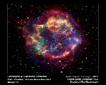 今から320年ほど前にカシオペア座の方向、地球から約1万光年離れた場所で、超新星爆発が起こりました。残念ながら過去の爆発記録は残っていませんが、超新星残骸では最も若いもののひとつでカシオペア座Aと呼ばれています。右の写真はNASAのスピッツァー望遠鏡とチャンドラ衛星より提供される写真を合成したものです。直径は15光年ほどで、秒速4000キロメートルから5000キロメートルもの速さで広がり続けていると考えられています。