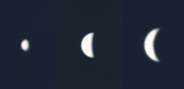 ![]() ・地球と金星の位置関係により、金星の形や大きさが変化します。 ・大きくなった頃の金星は、細い電線にかかっても完全には消えません。 ・天体望遠鏡では100倍くらいの倍率をかければ十分でしょう。 ・内合の頃には新月か細い三日月形の大きな金星を見ることができます。 ・外合の頃には満月形の小さな金星になります。 ・東方最大離角や西方最大離角の頃には半月形になります。大きさは中くらいの大きさです。 ・「つるちゃんのプラネタリウム for Javaアプレット」の中にある「惑星の満ち欠け」を参考にしてください。 |